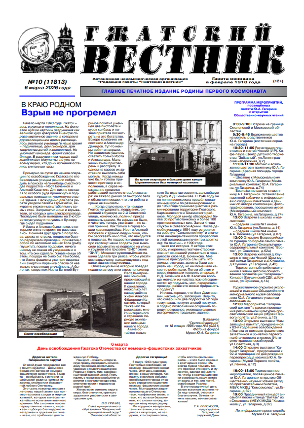 Кошелёк ТРУДОВАЯ ИНСПЕКЦИЯ. Работа «за спасибо» 09.03.2026 Культура БИБЛИОТЕКА. Женщина, весна и любовь 09.03.2026 Культура БИБЛИОТЕКА. Любовь в миноре и мажоре 09.03.2026 Культура БИБЛИОТЕКА. Займёмся ресайклингом? 09.03.2026 В краю родном В КРАЮ РОДНОМ. Незабываемые встречи 09.03.2026 В краю родном В КРАЮ РОДНОМ. Взрыв не прогремел 06.03.2026 Формула победы СПАРТАКИАДА. Валенок на лыжне 05.03.2026 Общество ТРУДОВАЯ ИНСПЕКЦИЯ. Эх, отдохнём! 05.03.2026 Формула победы ПАУЭРЛИФТИНГ. Гагаринцы снова лучшие 05.03.2026 Культура БИБЛИОТЕКА. Ангел, Хранитель мой! 05.03.2026 Афиша КОНЦЕРТНЫЙ ЗАЛ. Симфония си минор 05.03.2026 Формула победы ПЛАВАНИЕ. Сложная эстафета 04.03.2026 Формула победы САМБО. Проверка на характер 04.03.2026 Формула победы ПОДАРОК. Вклад в спортивное искусство 04.03.2026 Общество ПАМЯТЬ. Они ушли в ночь, чтобы мы встретили рассвет 04.03.2026 «ГЖАТСКИЙ ВЕСТНИК» от 30.01.2026