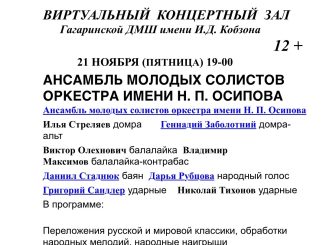 В виртуальном концертном зале Гагаринской детской музыкальной школы покажут выступление Ансамбля молодых солистов оркестра имени Н.П. Осипова.