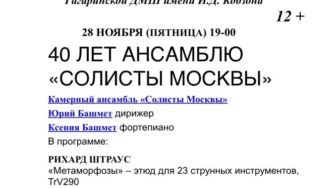 В виртуальном концертном зале Гагаринской детской музыкальной школы покажут концерт, посвящённый 40-летию ансамбля «Солисты Москвы».