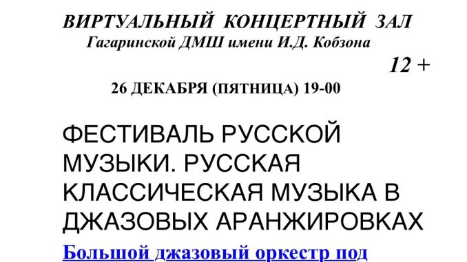 Завершит музыкальный год концерт «Фестиваль русской музыки»: русская классическая музыка в джазовых аранжировках прозвучит в исполнении Большого джазового оркестра под управлением Петра Востокова.