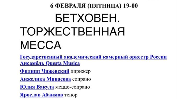 Произведение одного из наиболее исполняемых композиторов в мире в этот раз на суд публики представят музыканты Государственного академического камерного оркестра России и ансамбля «Questa Musica», дирижёр Филипп Чижевский, а также Анжелика Минасова (сопрано), Юлия Вакула (меццо-сопрано), Ярослав Абаимов (тенор) и Игорь Подоплелов (баритон).