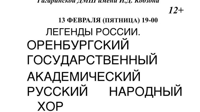 Увидеть концерт «Легенды России» гагаринцы смогут в пятницу, 13 февраля. Начало в 19:00. Вход свободный. Возрастное ограничение 12+.